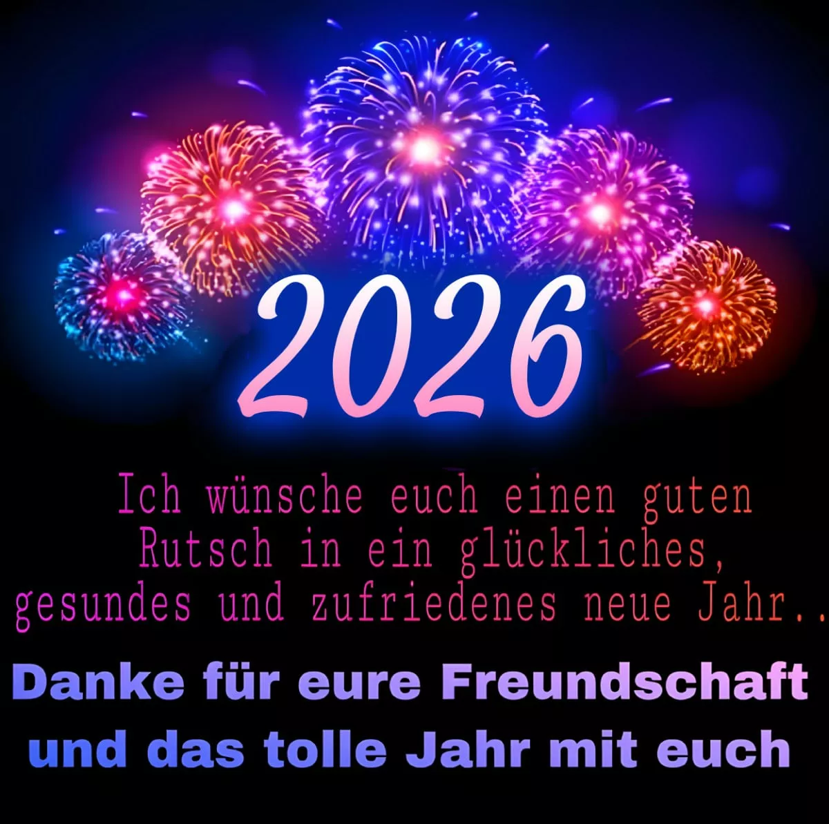 2026. Ich wünsche euch... 2026. Ich wünsche euch einen guten Rutsch in ein glückliches, gesunds und zufriedenes neue Jahr. Danke für eure Freundschaft und das tolle Jahr mit euch. Link: Code für Blogs: Code für Forum: Guten Rutsch Bilder