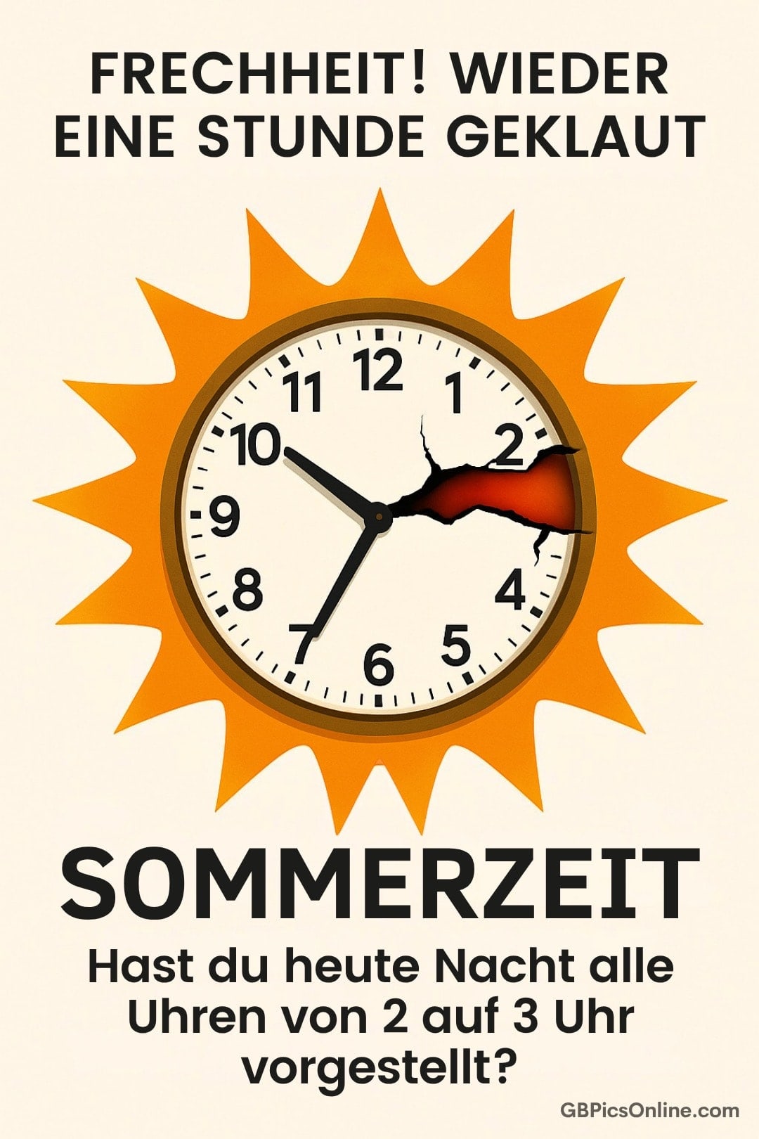 Es ist wieder soweit: Die... Frechheit! Wieder eine Stunde geklaut. Sommerzeit. Hast du heute Nacht alle Uhren von 2 auf 3 Uhr vorgestellt? Link: Code für Blogs: Code für Forum: Sommerzeit Bilder