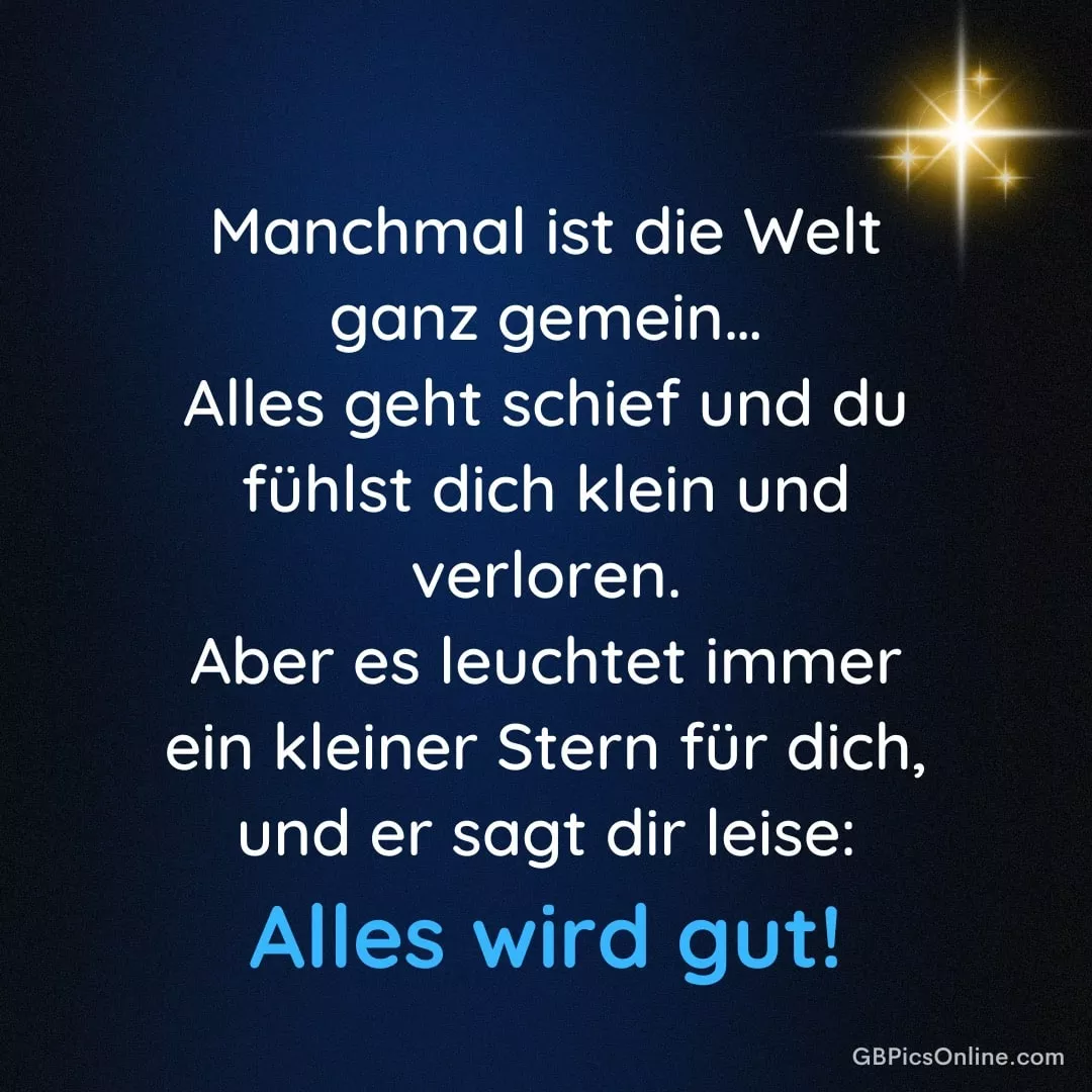 Manchmal ist die Welt ganz... Manchmal ist die Welt ganz gemein... Alles geht schief und du fühlst dich klein und verloren. Aber es leuchtet immer ein kleiner Stern für dich, und er sagt dir leise: Alles wird gut! Link: Code für Blogs: Code für Forum: Trost Bilder