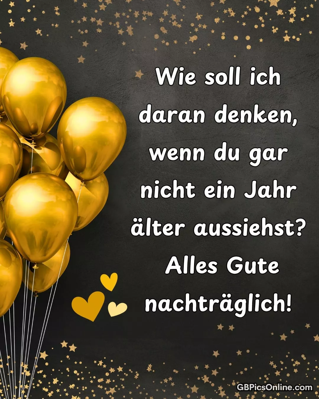 Wie soll ich daran denken... Wie soll ich daran denken, wenn du gar nicht ein Jahr älter aussiehst? Alles Gute nachträglich! Link: Code für Blogs: Code für Forum: Geburtstag nachträglich Bilder