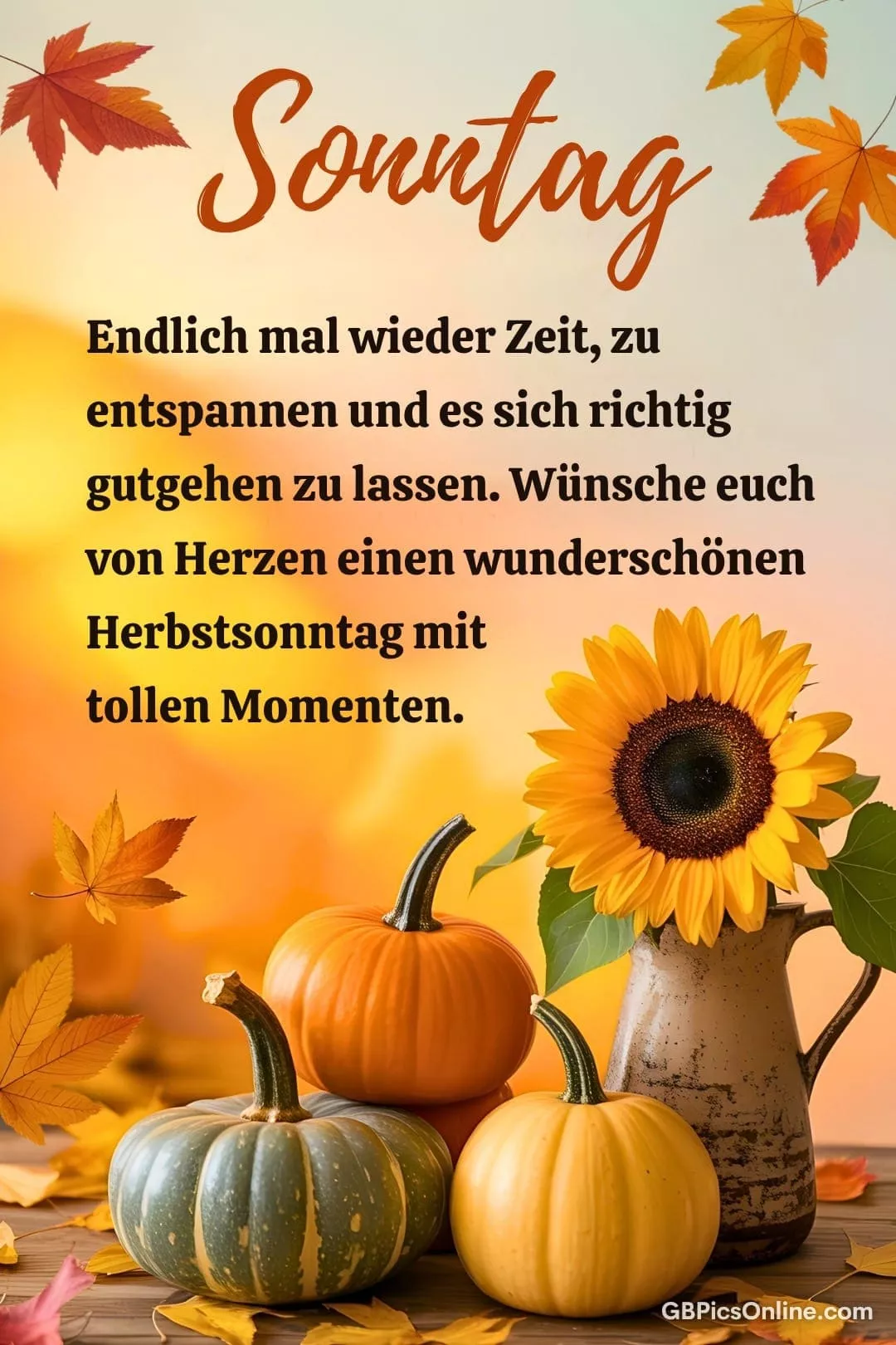 Sonntag. Endlich mal... Sonntag. Endlich mal wieder Zeit, zu entspannen und es sich richtig gutgehen zu lassen. Wünsche euch von Herzen einen wunderschönen Herbstsonntag mit tollen Momenten. Link: Code für Blogs: Code für Forum: Sonntag Bilder
