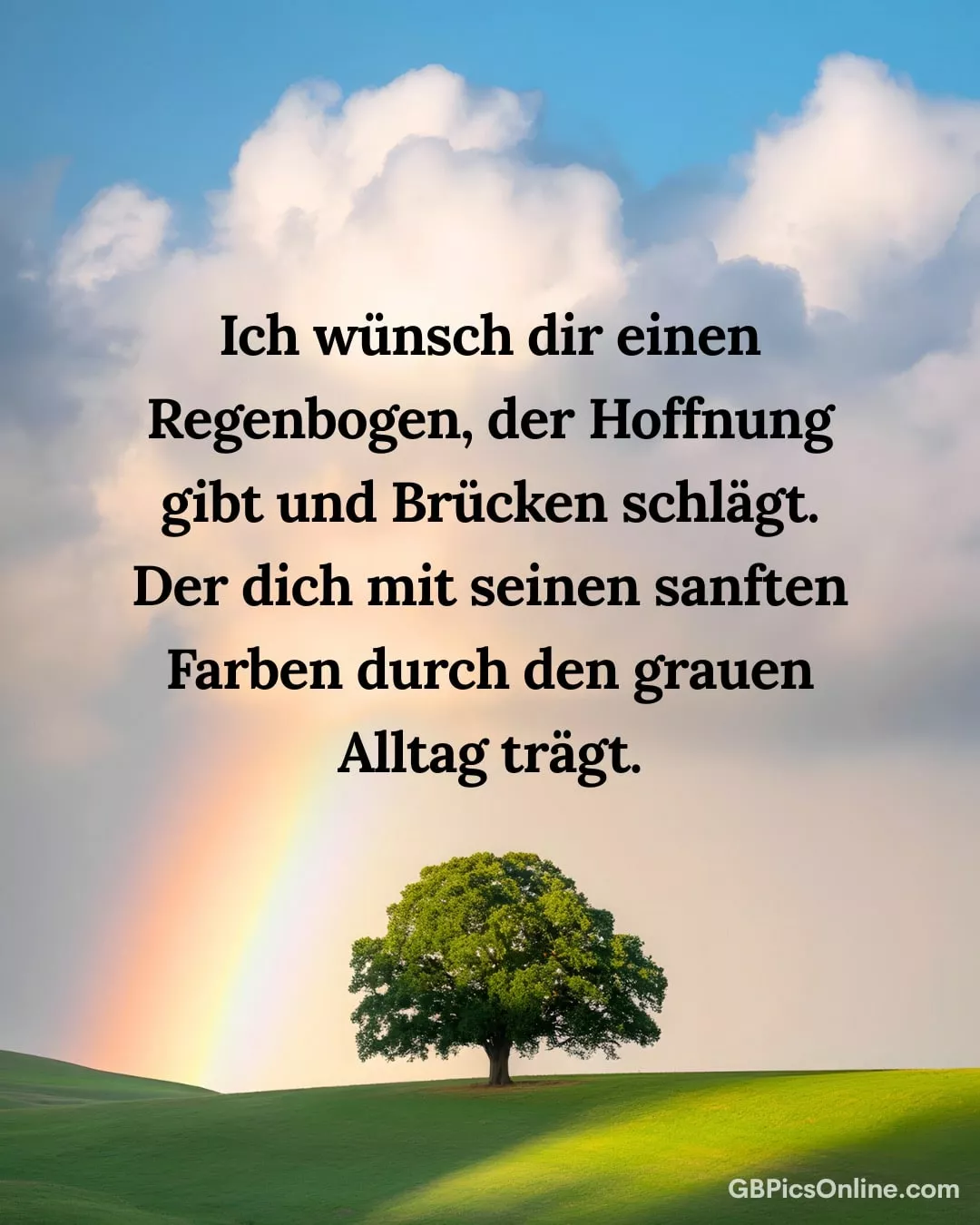 Ich wünsch dir einen... Ich wünsch dir einen Regenbogen, der Hoffnung gibt und Brücken schlägt, der dich mit seinen sanften Farben durch den grauen Alltag trägt. Link: Code für Blogs: Code für Forum: Nettigkeiten Bilder
