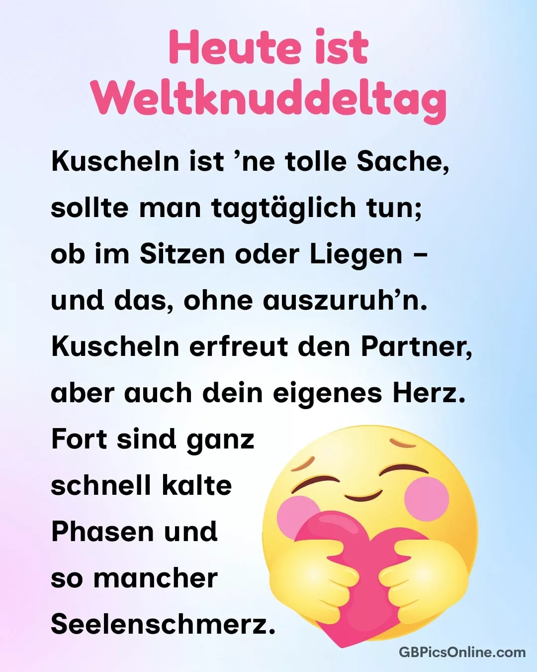Kuscheln ist ’ne tolle Sache, sollte man tagtäglich tun; ob im Sitzen oder Liegen - und das, ohne auszuruh’n. Kuscheln erfreut den Partner, aber auch dein eigenes Herz. Fort sind ganz schnell kalte Phasen und so mancher Seelenschmerz.