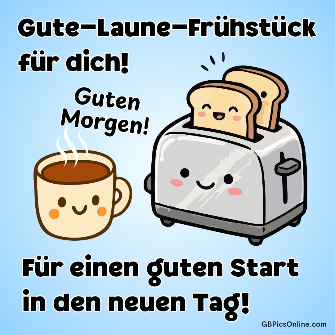Gute-Laune-Frühstück für... Gute-Laune-Frühstück für dich! Guten Morgen! Für einen guten Start in den neuen Tag! Link: Code für Blogs: Code für Forum: Guten Morgen Bilder