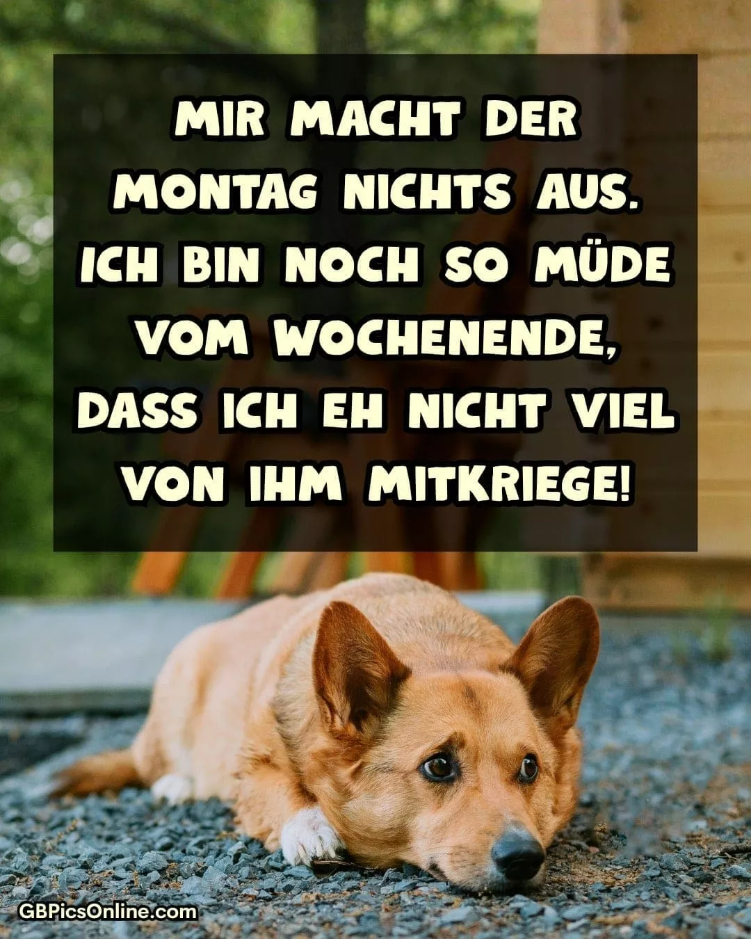 Ein müder Corgi parkt... Ein müder Corgi parkt gemütlich im Energiesparmodus auf dem Boden. Mir macht der Montag nichts aus. Ich bin noch so müde vom Wochenende, dass ich eh nicht viel von ihm mitkriege! Link: Code für Blogs: Code für Forum: Montag Bilder