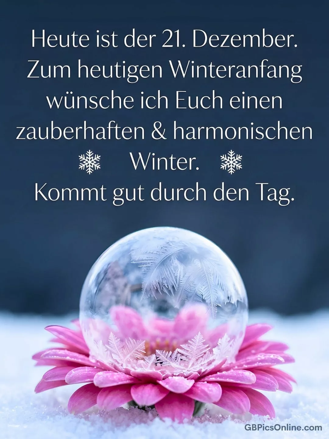 Eine gefrorene Seifenblase... Eine gefrorene Seifenblase ruht kunstvoll auf einer pinken Blüte. Heute ist der 21. Dezember. Zum heutigen Winteranfang wünsche ich euch einen zauberhaften & harmonischen Winter. Kommt gut durch den Tag. Link: Code für Blogs: Code für Forum: Winteranfang Bilder
