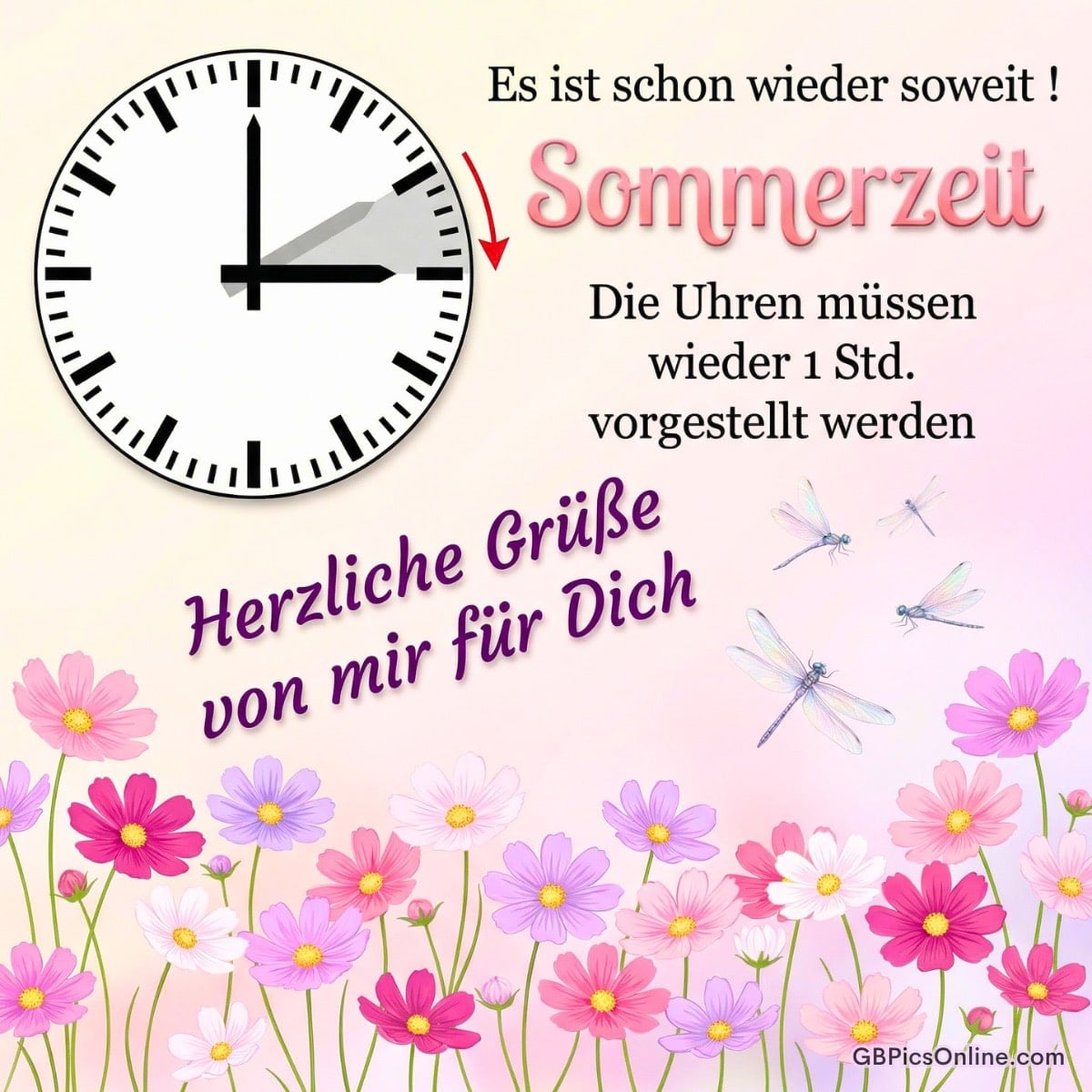 Bunte Blüten und zarte... Bunte Blüten und zarte Libellen begleiten den fröhlichen Wechsel in die helle Jahreszeit. Es ist schon wieder soweit! Sommerzeit. Die Uhren müssen wieder 1 Std. vorgestellt werden. Herzliche Grüße von mir für dich. Link: Code für Blogs: Code für Forum: Sommerzeit Bilder