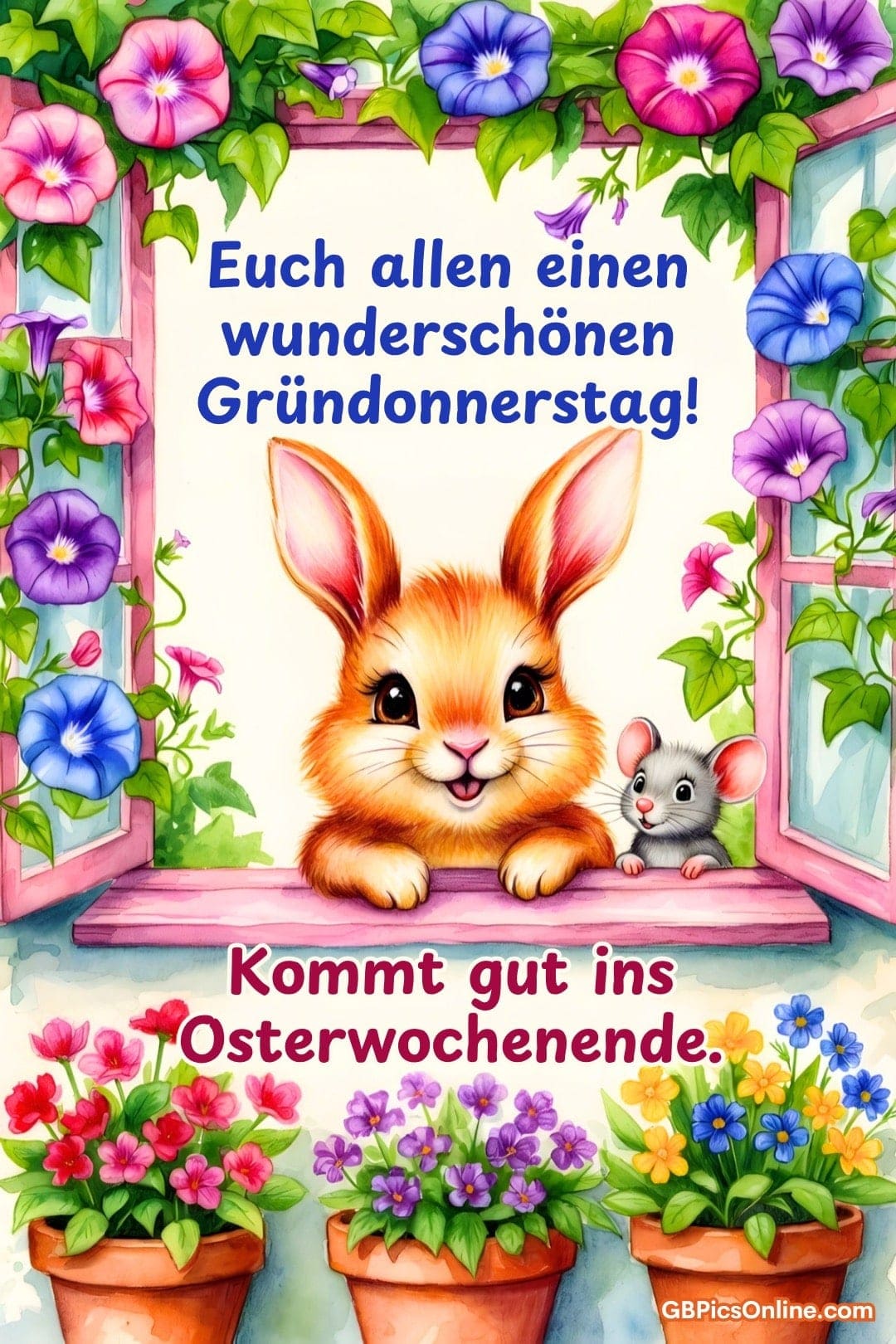Ein fröhliches Häschen und... Ein fröhliches Häschen und eine Maus winken aus dem Blumenfenster in pastellbunter Märchenoptik. Euch allen einen wunderschönen Gründonnerstag! Kommt gut ins Osterwochenende. Link: Code für Blogs: Code für Forum: Gründonnerstag Bilder