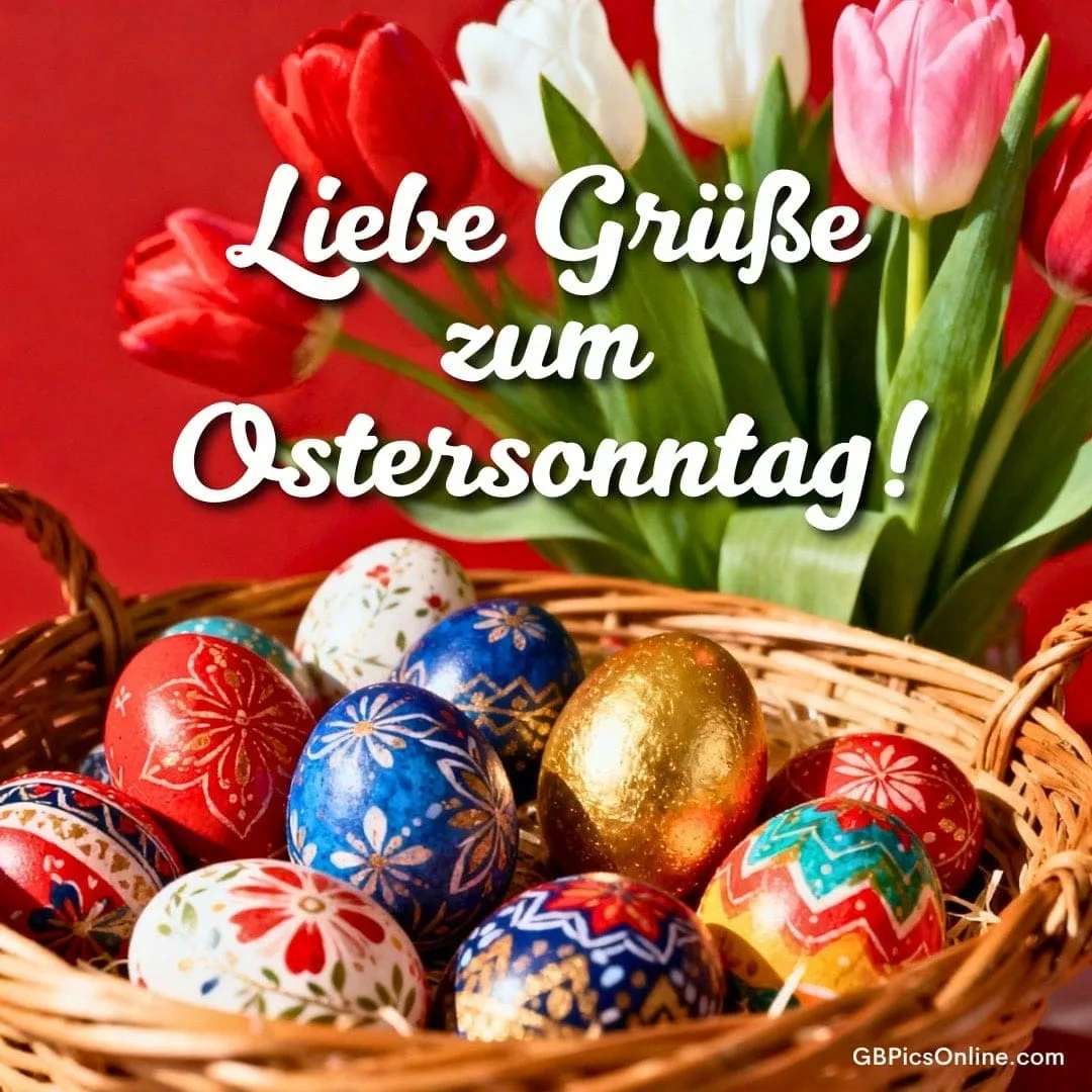 Bunte Eier im Weidenkorb... Bunte Eier im Weidenkorb und leuchtende Tulpen bringen festliche Farben auf den Tisch. Liebe Grüße zum Ostersonntag! Link: Code für Blogs: Code für Forum: Ostersonntag Bilder
