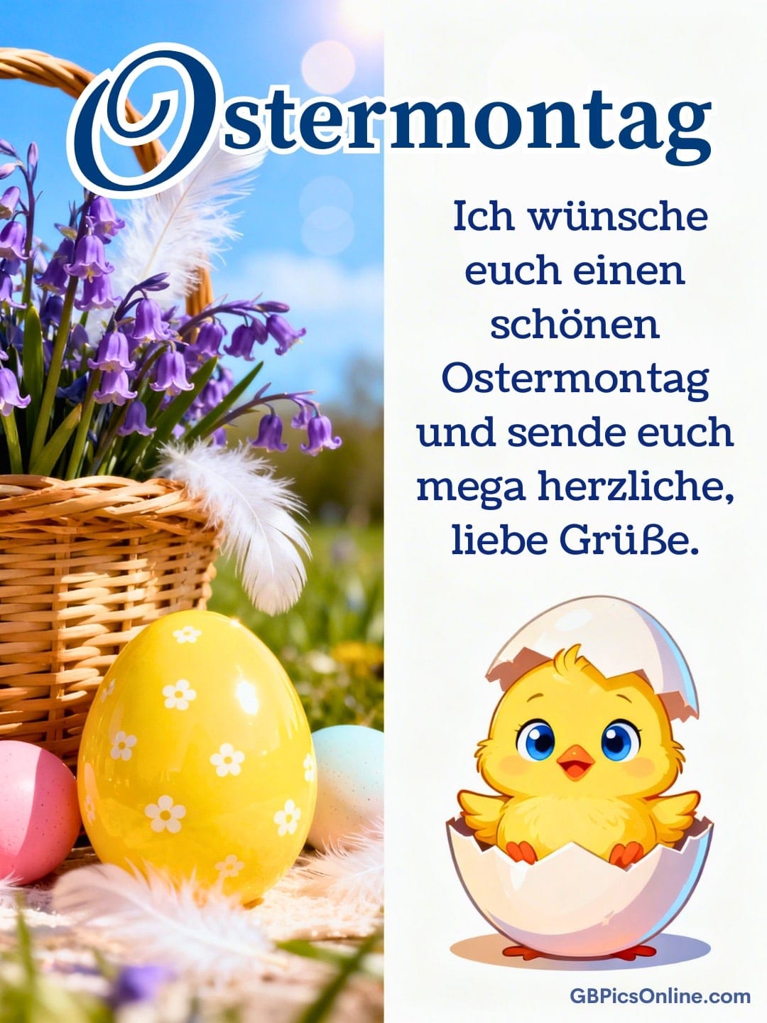 Ein freches Küken schlüpft... Ein freches Küken schlüpft neben bunten Eiern und violetten Glockenblumen hervor. Ostermontag. Ich wünsche euch einen schönen Ostermontag und sende euch mega herzliche, liebe Grüße. Link: Code für Blogs: Code für Forum: Ostermontag Bilder