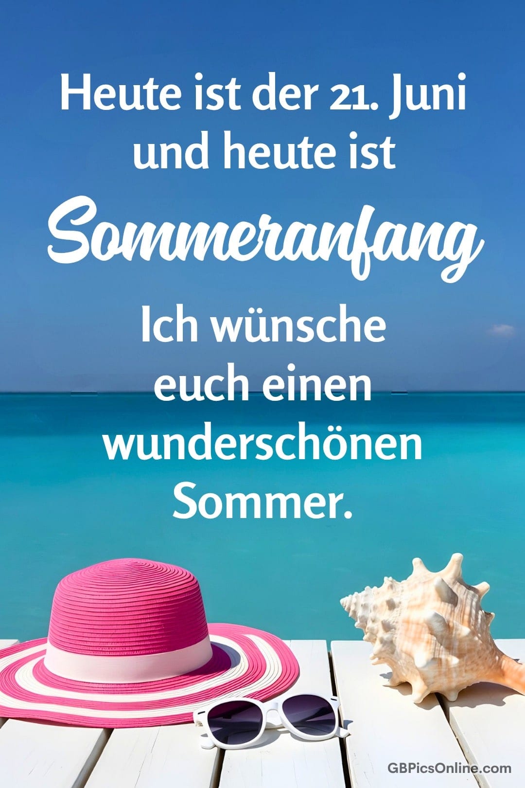 Ein pinker Sonnenhut, eine... Ein pinker Sonnenhut, eine Muschel und eine Sonnenbrille liegen vor türkisblauem Meer. Heute ist der 21. Juni und heute ist Sommeranfang. Ich wünsche euch einen wunderschönen Sommer. Link: Code für Blogs: Code für Forum: Sommeranfang Bilder