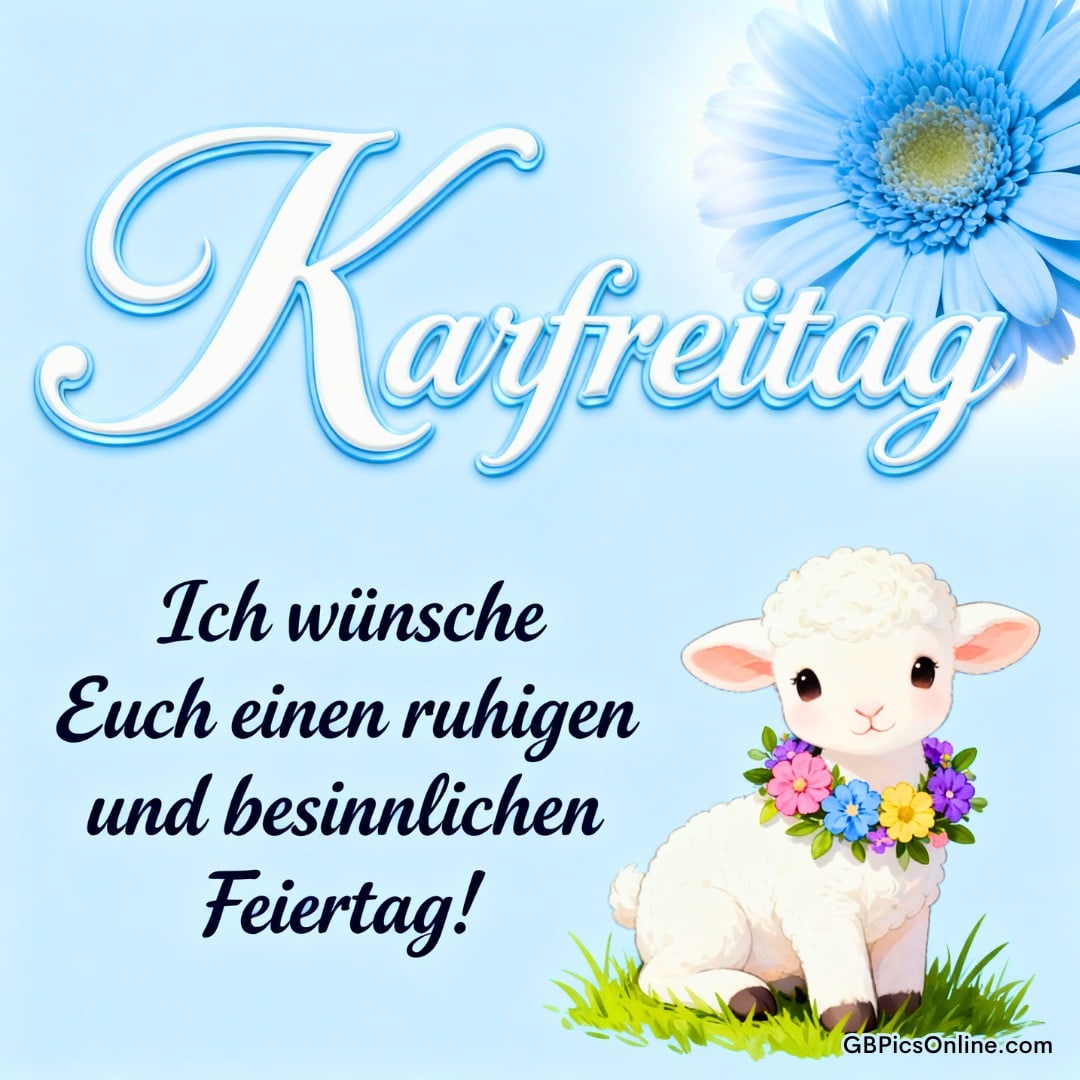 Ein süßes Lamm mit Blumenkr... Ein süßes Lamm mit Blumenkranz bringt sanfte Feiertagsgrüße in Pastellblau. Karfreitag. Ich wünsche euch einen ruhigen und besinnlichen Feiertag! Link: Code für Blogs: Code für Forum: Karfreitag Bilder