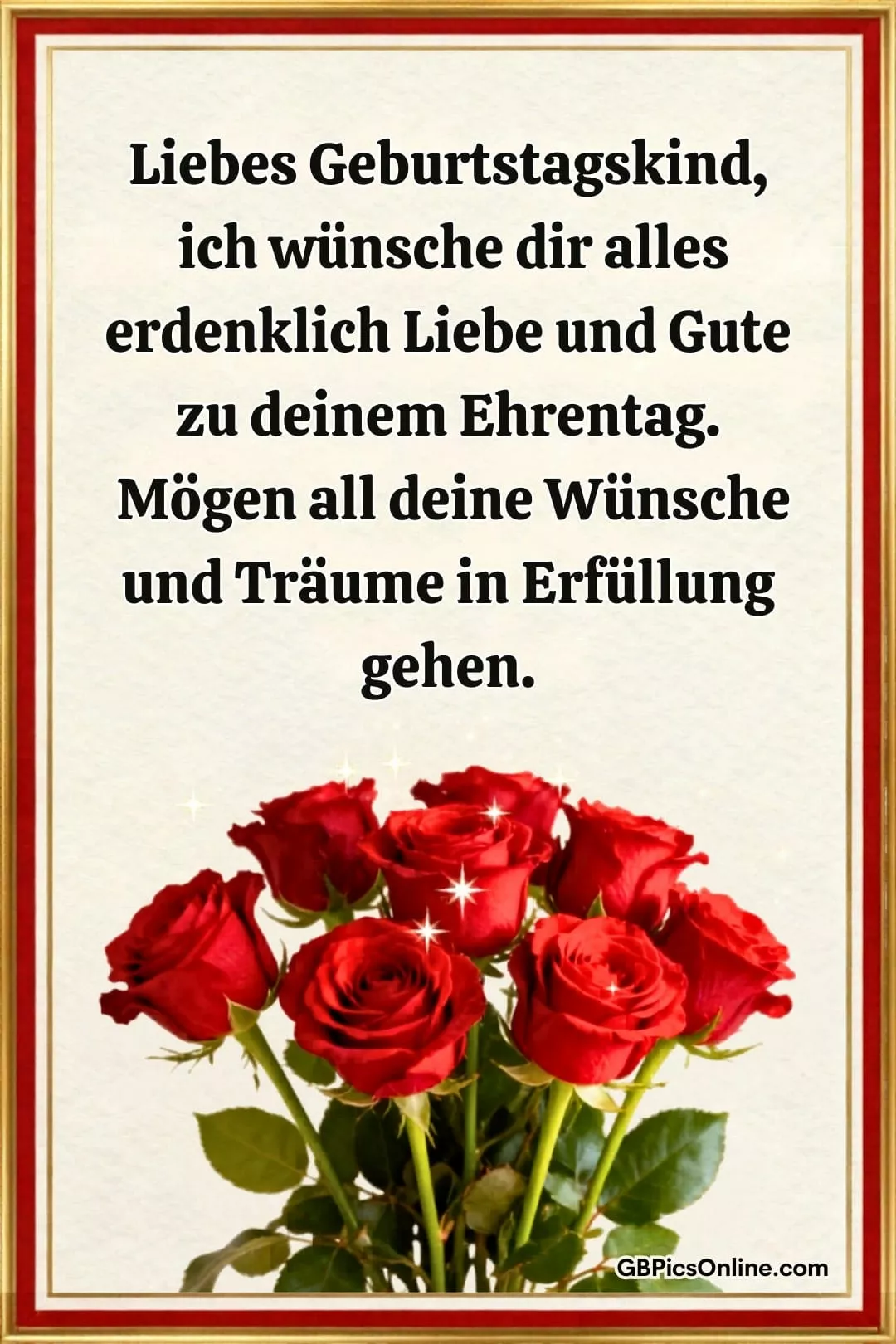 Ein funkelnder Strauß... Ein funkelnder Strauß roter Rosen setzt einen festlichen Akzent in klassischem Rahmen. Liebes Geburtstagskind, ich wünsche dir alles erdenklich Liebe und Gute zu deinem Ehrentag. Mögen all deine Wünsche und Träume in Erfüllung gehen. Link: Code für Blogs: Code für Forum: Geburtstag Bilder