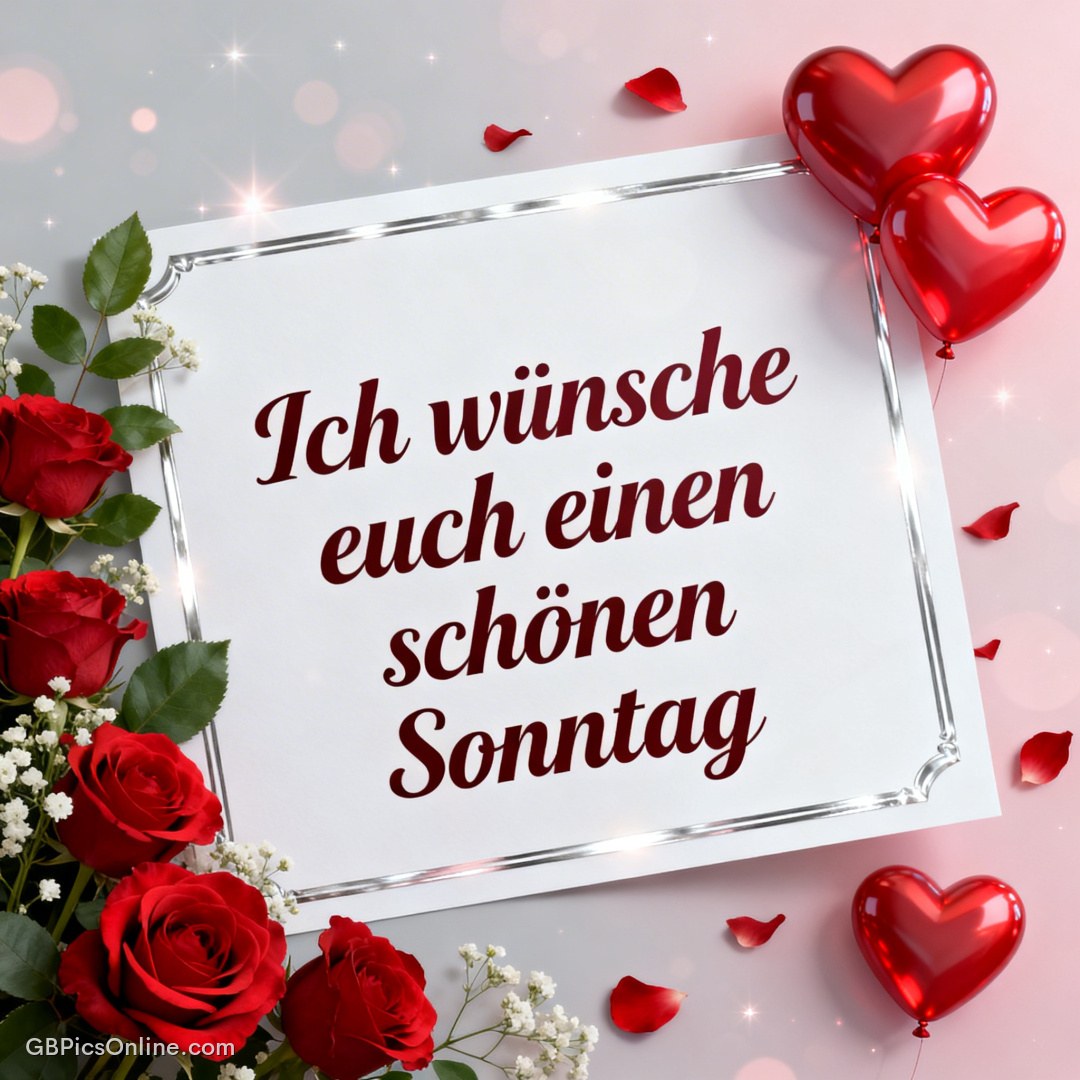 Rote Rosen und Herzballons... Rote Rosen und Herzballons rahmen eine liebevolle Sonntagsbotschaft in funkelndem Design ein. Ich wünsche euch einen schönen Sonntag. Link: Code für Blogs: Code für Forum: Sonntag Bilder