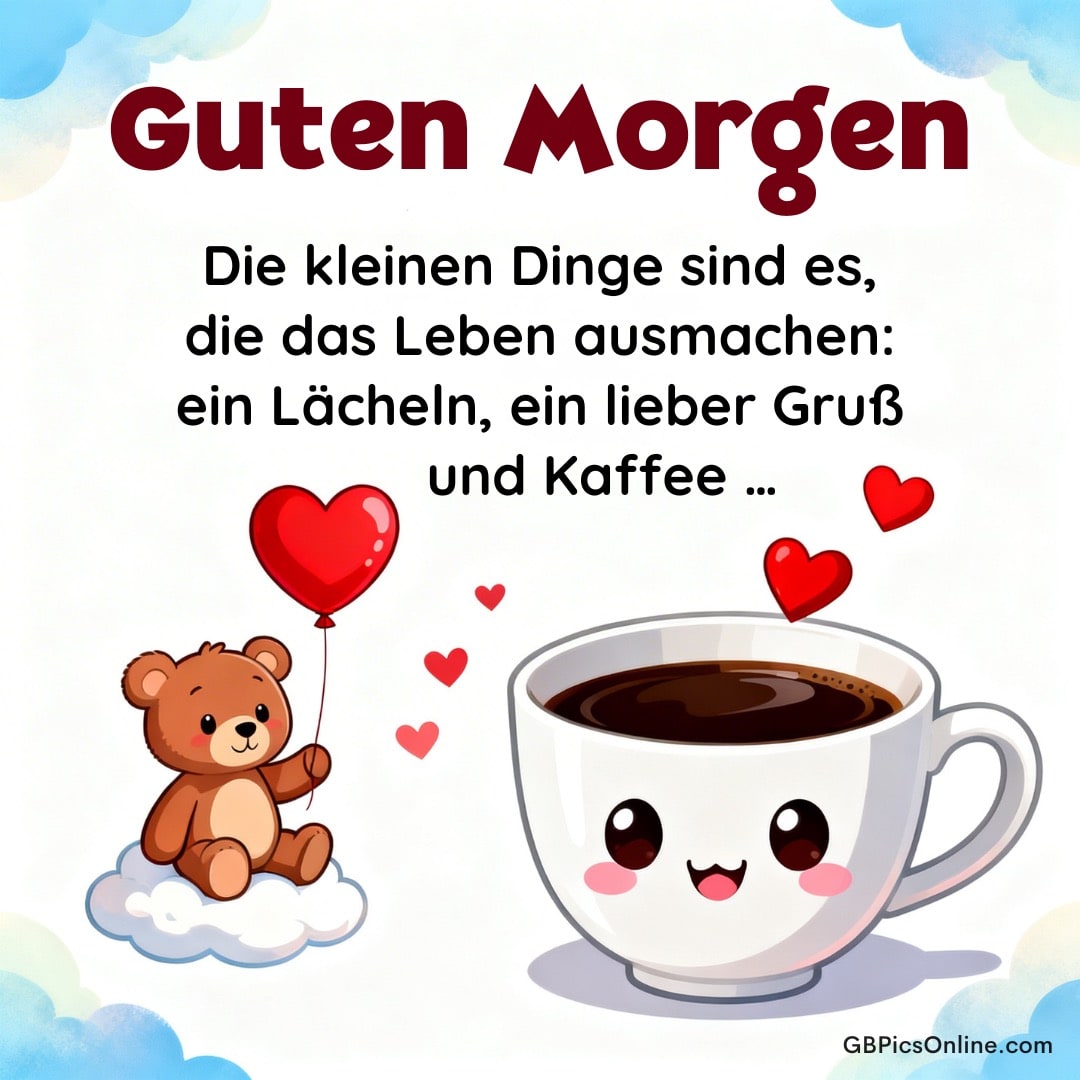 Ein niedlicher Kaffeebecher... Ein niedlicher Kaffeebecher und ein Teddy verbreiten gute Laune. Guten Morgen. Die kleinen Dinge sind es, die das Leben ausmachen: ein Lächeln, ein lieber Gruß und Kaffee ... Link: Code für Blogs: Code für Forum: Guten Morgen Bilder