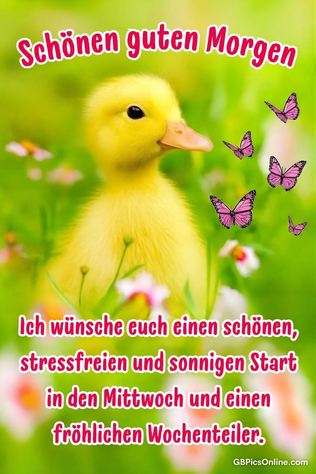 Ein flauschiges Entenküken... Ein flauschiges Entenküken staunt über tanzende Schmetterlinge zwischen Frühlingsblüten. Schönen guten Morgen. Ich wünsche euch einen schönen, stressfreien und sonnigen Start in den Mittwoch und einen fröhlichen Wochenteiler. Link: Code für Blogs: Code für Forum: Mittwoch Bilder
