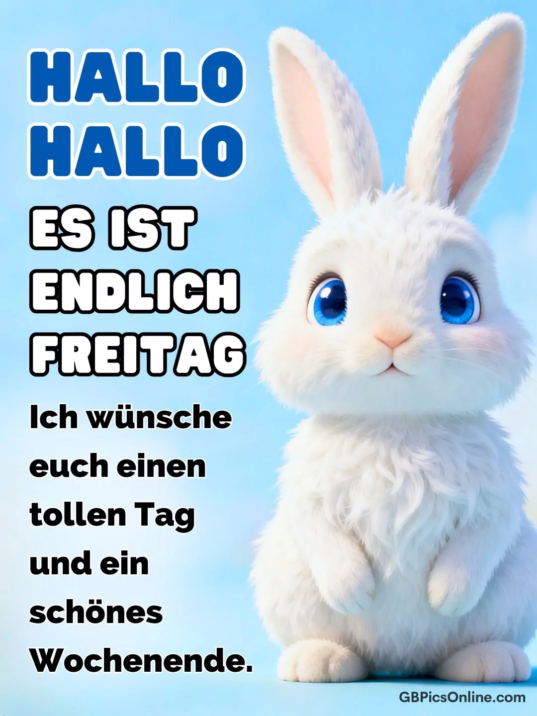 Ein flauschiger Hase mit... Ein flauschiger Hase mit großen Kulleraugen kündigt fröhlich den Start ins Wochenende an. Hallo hallo. Es ist endlich Freitag. Ich wünsche euch einen tollen Tag und ein schönes Wochenende. Link: Code für Blogs: Code für Forum: Freitag Bilder
